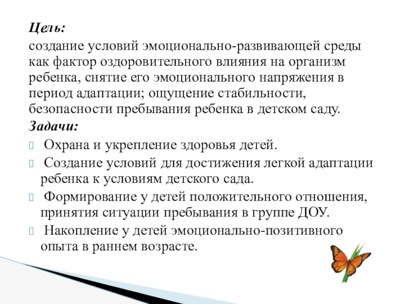 ребенка, снятие его эмоционального напряжения в период адаптации; ощущение стабильности, безопасности пребывания ребенка в детском саду.