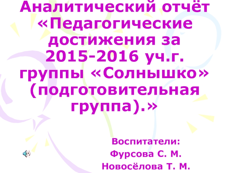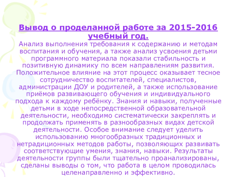 содержанию и методам воспитания и обучения, а также анализ усвоения детьми программного материала показали стабильность и позитивную динамику по всем направлениям развития. Положительное влияние на этот процесс оказывает тесное сотрудничество воспитателей, специалистов, администрации ДОУ и родителей, а также использование приёмов развивающего обучения и индивидуального подхода к каждому ребёнку. Знания и навыки, полученные детьми в ходе непосредственной образовательной деятельности, необходимо систематически закреплять и продолжать применять в разнообразных видах детской деятельности. Особое внимание следует уделить использованию многообразных традиционных и нетрадиционных методов работы, позволяющих развивать соответствующие умения, знания, навыки. Результаты деятельности группы были тщательно проанализированы, сделаны выводы о том, что работа в целом проводилась целенаправленно и эффективно.