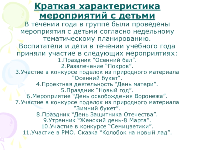 Воспитатели и дети в течении учебного года приняли участие в следующих мероприятиях: