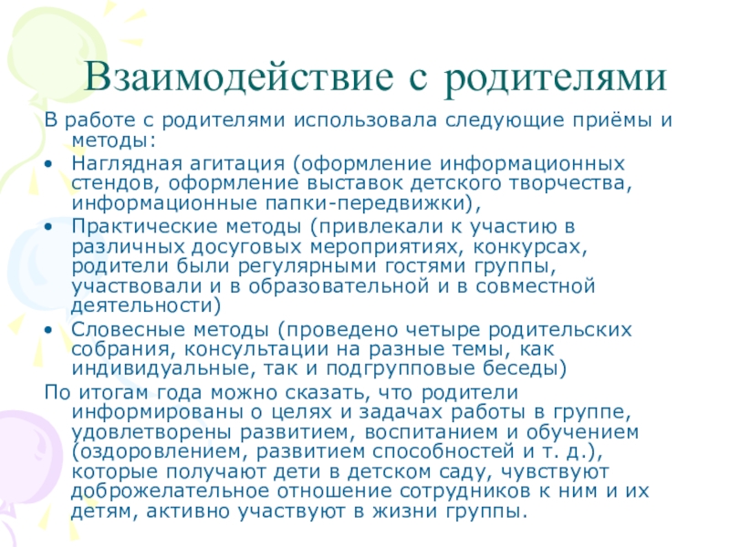 По итогам года можно сказать, что родители информированы о целях и задачах работы в группе, удовлетворены развитием, воспитанием и обучением (оздоровлением, развитием способностей и т. д.), которые получают дети в детском саду, чувствуют доброжелательное отношение сотрудников к ним и их детям, активно участвуют в жизни группы.