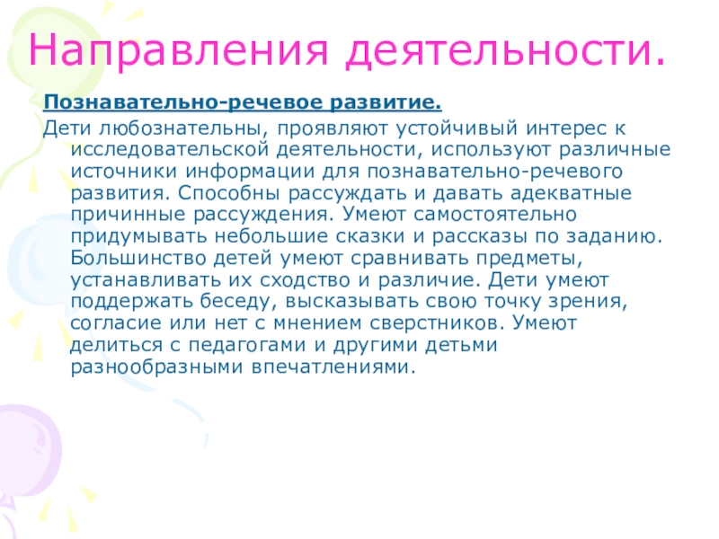 различные источники информации для познавательно-речевого развития. Способны рассуждать и давать адекватные причинные рассуждения. Умеют самостоятельно придумывать небольшие сказки и рассказы по заданию. Большинство детей умеют сравнивать предметы, устанавливать их сходство и различие. Дети умеют поддержать беседу, высказывать свою точку зрения, согласие или нет с мнением сверстников. Умеют делиться с педагогами и другими детьми разнообразными впечатлениями.