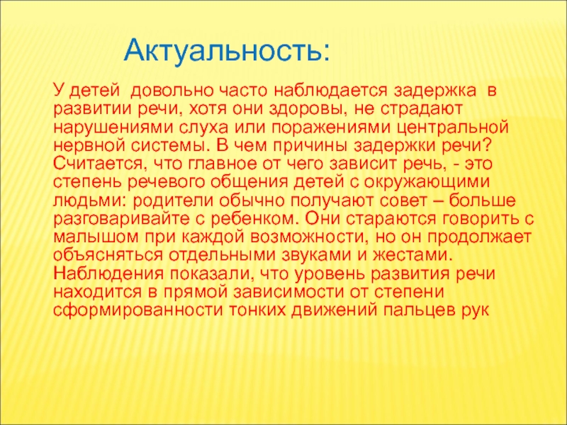 здоровы, не страдают нарушениями слуха или поражениями центральной нервной системы. В чем причины задержки речи? Считается, что главное от чего зависит речь, - это степень речевого общения детей с окружающими людьми: родители обычно получают совет – больше разговаривайте с ребенком. Они стараются говорить с малышом при каждой возможности, но он продолжает объясняться отдельными звуками и жестами.