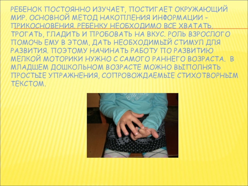 ПРИКОСНОВЕНИЯ. РЕБЕНКУ НЕОБХОДИМО ВСЕ ХВАТАТЬ, ТРОГАТЬ, ГЛАДИТЬ И ПРОБОВАТЬ НА ВКУС. РОЛЬ ВЗРОСЛОГО ПОМОЧЬ ЕМУ В ЭТОМ, ДАТЬ НЕОБХОДИМЫЙ СТИМУЛ ДЛЯ РАЗВИТИЯ. ПОЭТОМУ НАЧИНАТЬ РАБОТУ ПО РАЗВИТИЮ МЕЛКОЙ МОТОРИКИ НУЖНО С САМОГО РАННЕГО ВОЗРАСТА. В МЛАДШЕМ ДОШКОЛЬНОМ ВОЗРАСТЕ МОЖНО ВЫПОЛНЯТЬ ПРОСТЫЕ УПРАЖНЕНИЯ, СОПРОВОЖДАЕМЫЕ СТИХОТВОРНЫМ ТЕКСТОМ.
