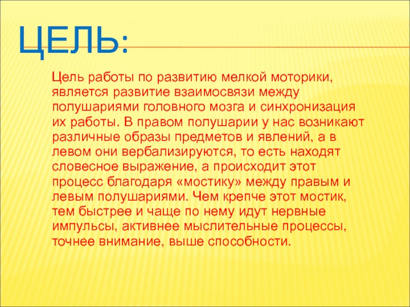 Цель работы по развитию мелкой моторики, является развитие взаимосвязи между полушариями