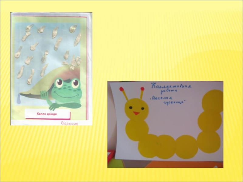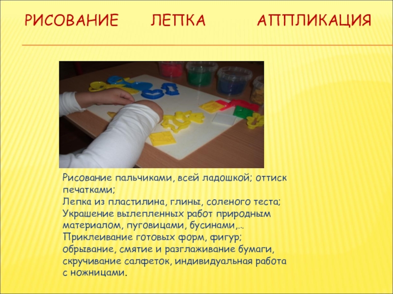 Приклеивание готовых форм, фигур; обрывание, смятие и разглаживание бумаги, скручивание салфеток, индивидуальная работа с ножницами.