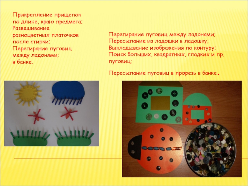 Слайд 16Прикрепление прищепок по длине, краю предмета;