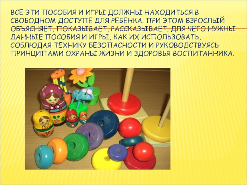 Слайд 27ВСЕ ЭТИ ПОСОБИЯ И ИГРЫ ДОЛЖНЫ НАХОДИТЬСЯ В СВОБОДНОМ ДОСТУПЕ ДЛЯ