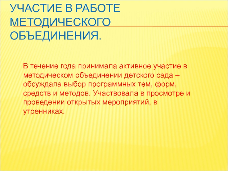 методическом объединении детского сада – обсуждала выбор программных тем, форм, средств и методов. Участвовала в просмотре и проведении открытых мероприятий, в утренниках.