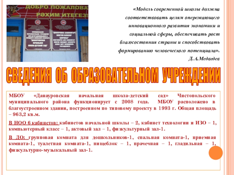 МБОУ «Данауровская начальная школа-детский сад» Чистопольского муниципального района функционирует с 2008 года. МБОУ расположено в благоустроенном здании, построенном по типовому проекту в 1993 г. Общая площадь – 963,2 кв.м.