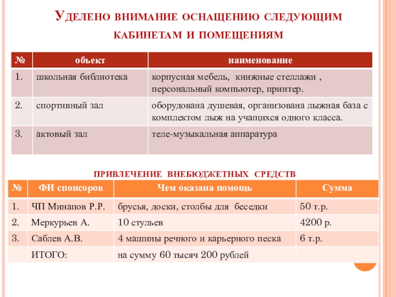 В НОО 6 кабинетов: кабинетов начальной школы – 2, кабинет технологии и ИЗО – 1, компьютерный класс – 1, актовый зал – 1, физкультурный зал-1.