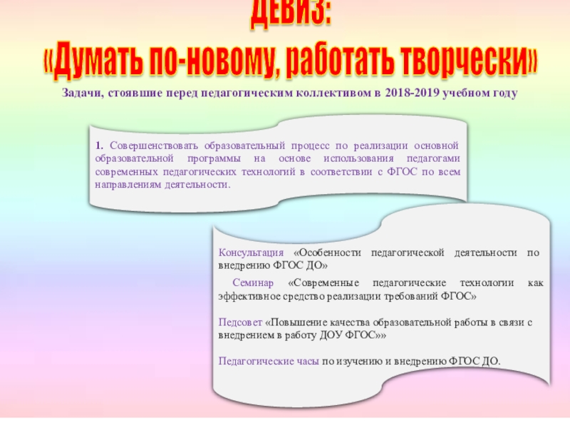 1. Совершенствовать образовательный процесс по реализации основной образовательной программы на основе использования педагогами современных педагогических технологий в соответствии с ФГОС по всем направлениям деятельности.