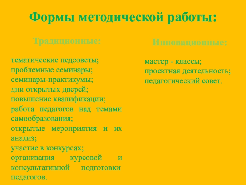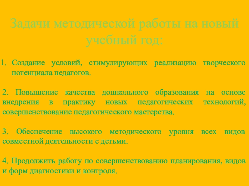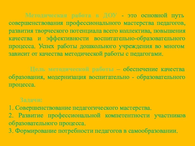 профессионального мастерства педагогов, развития творческого потенциала всего коллектива, повышения качества и эффективности воспитательно-образовательного процесса. Успех работы дошкольного учреждения во многом зависит от качества методической работы с педагогами.