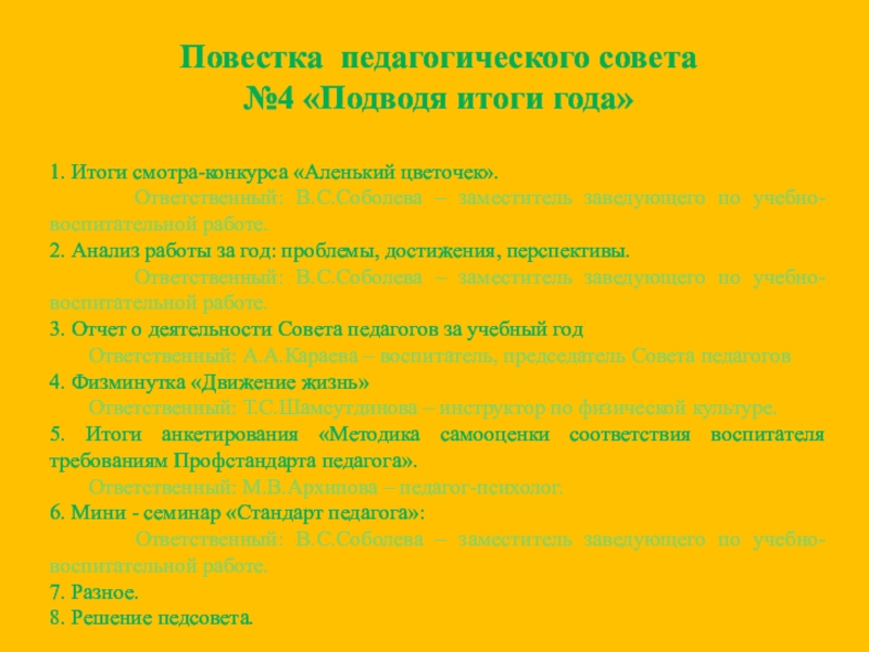Ответственный: А.А.Караева – воспитатель, председатель Совета педагогов