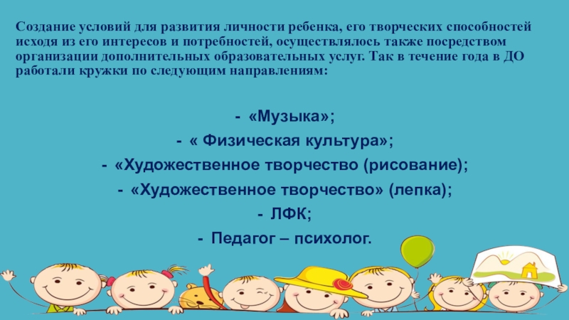 его интересов и потребностей, осуществлялось также посредством организации дополнительных образовательных услуг. Так в течение года в ДО работали кружки по следующим направлениям: