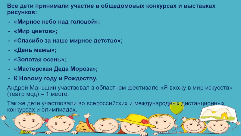 Слайд 9Все дети принимали участие в общедомовых конкурсах и выставках рисунков: