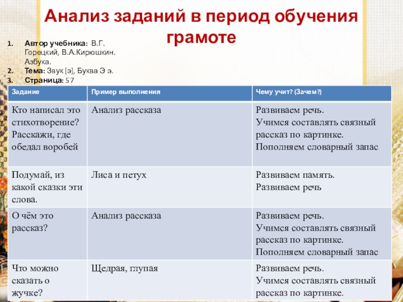 Анализ заданий в период обучения грамотеАвтор учебника:  В.Г. Горецкий, В.А.Кирюшкин. Азбука.  Тема: Звук [э], Буква Э э. Страница: 57