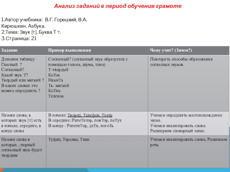 Анализ заданий в период обучения грамоте1.Автор учебника: В.Г. Горецкий, В.А.Кирюшкин. Азбука. 2.Тема: Звук [т], Буква Т т.3.Страница: 21