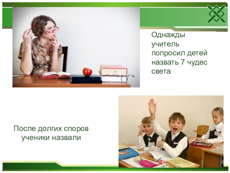 Однажды учитель попросил детей назвать 7 чудес светаПосле долгих споров ученики назвали