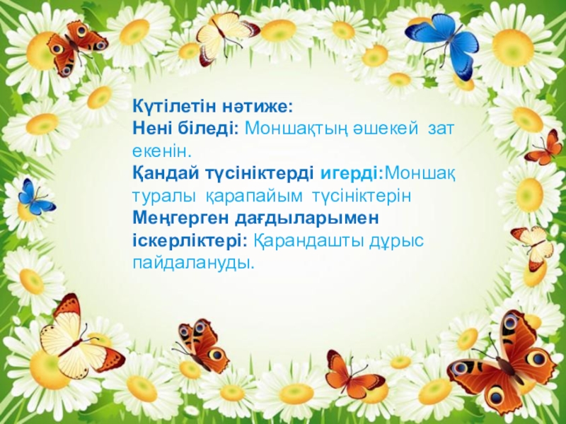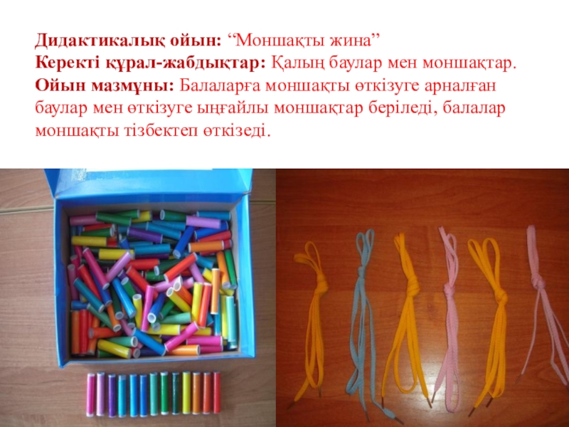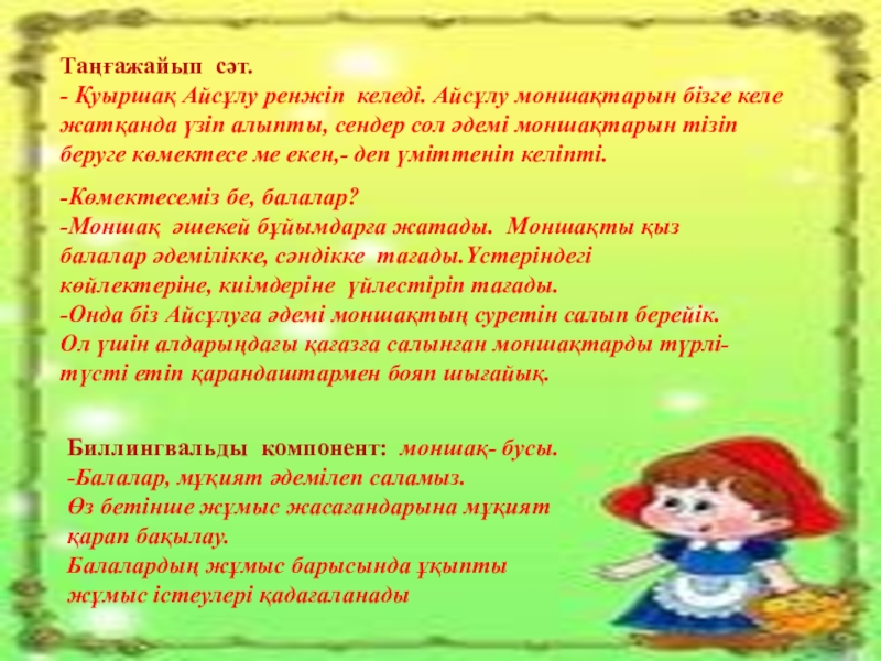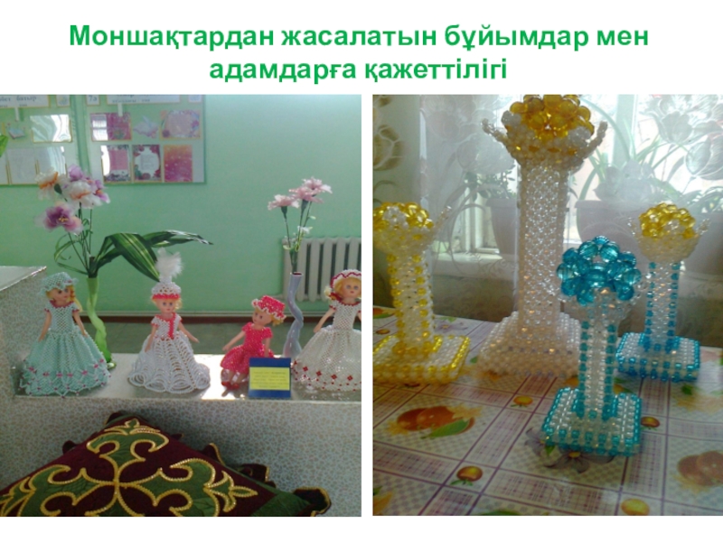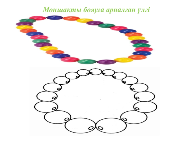 Қажетті құрал - жабдықтар: қуыршақ Айсұлу, түрлі -түсті моншақтар, әр балаға дайын салынған моншақ суреті, түрлі-түсті қарандаштар.