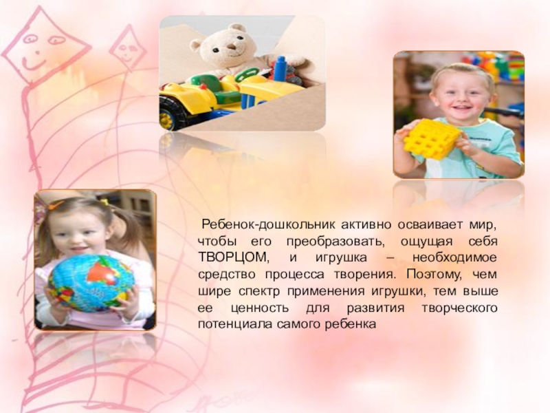 игрушка – необходимое средство процесса творения. Поэтому, чем шире спектр применения игрушки, тем выше ее ценность для развития творческого потенциала самого ребенка