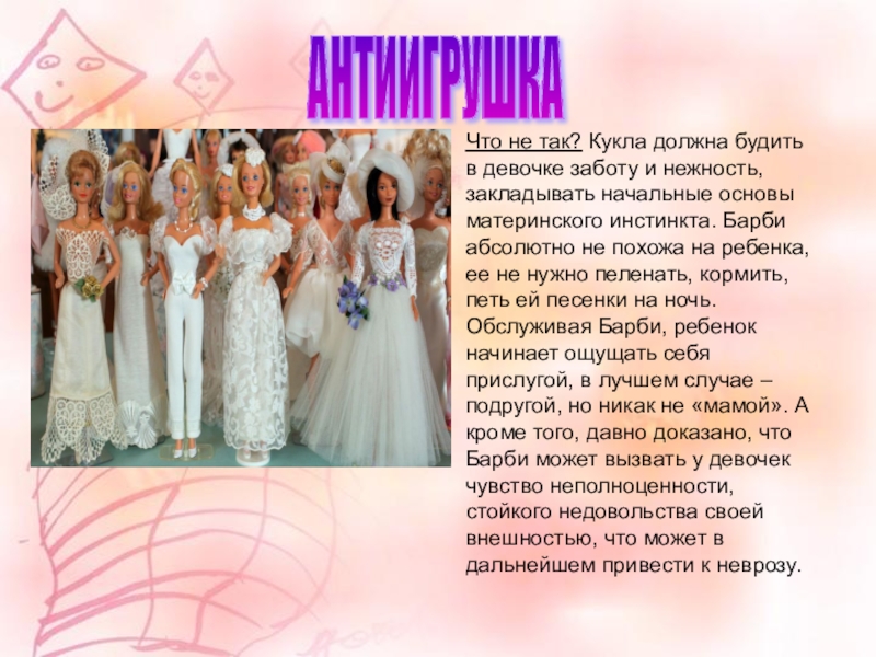 закладывать начальные основы материнского инстинкта. Барби абсолютно не похожа на ребенка, ее не нужно пеленать, кормить, петь ей песенки на ночь. Обслуживая Барби, ребенок начинает ощущать себя прислугой, в лучшем случае – подругой, но никак не «мамой». А кроме того, давно доказано, что Барби может вызвать у девочек чувство неполноценности, стойкого недовольства своей внешностью, что может в дальнейшем привести к неврозу.
