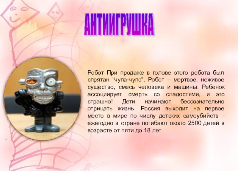 Робот – мертвое, неживое существо, смесь человека и машины. Ребенок ассоциирует смерть со сладостями, и это страшно! Дети начинают бессознательно отрицать жизнь. Россия выходит на первое место в мире по числу детских самоубийств – ежегодно в стране погибают около 2500 детей в возрасте от пяти до 18 лет