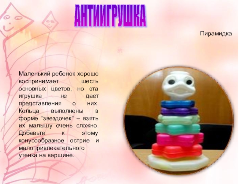игрушка не дает представления о них. Кольца выполнены в форме "звездочек" – взять их малышу очень сложно. Добавьте к этому конусообразное острие и малопривлекательного утенка на вершине.