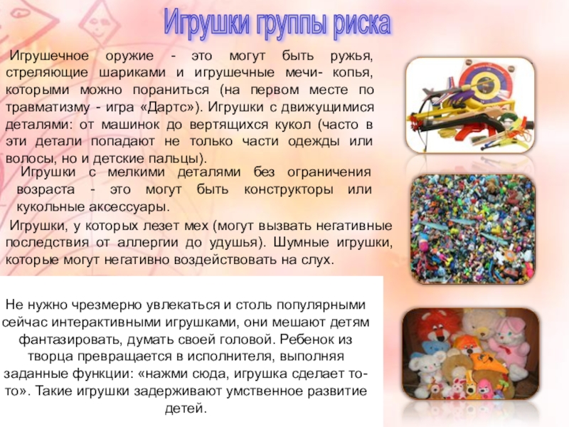 шариками и игрушечные мечи- копья, которыми можно пораниться (на первом месте по травматизму - игра «Дартс»). Игрушки с движущимися деталями: от машинок до вертящихся кукол (часто в эти детали попадают не только части одежды или волосы, но и детские пальцы).