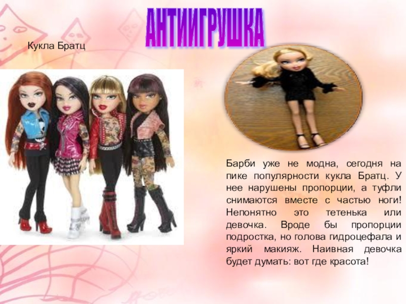 пике популярности кукла Братц. У нее нарушены пропорции, а туфли снимаются вместе с частью ноги! Непонятно это тетенька или девочка. Вроде бы пропорции подростка, но голова гидроцефала и яркий макияж. Наивная девочка будет думать: вот где красота!