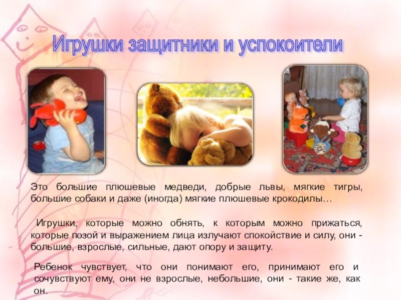 Игрушки, которые можно обнять, к которым можно прижаться, которые позой и выражением лица излучают спокойствие и силу, они - большие, взрослые, сильные, дают опору и защиту.