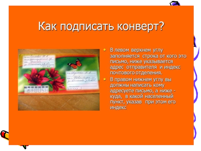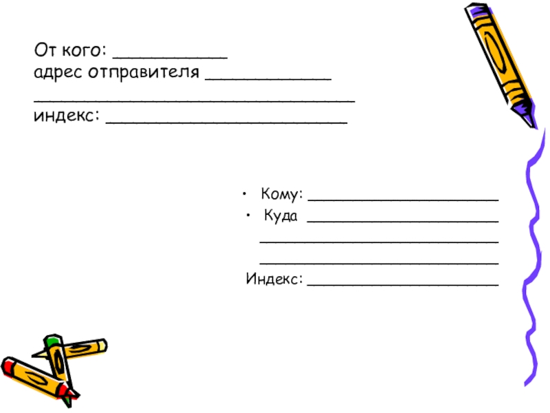 Слайд 6От кого: __________ адрес отправителя ___________ ____________________________ индекс: _____________________