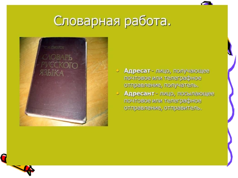 кто-нибудь или находится что-либо, а также надпись на письме, указывающая место назначения и получателя