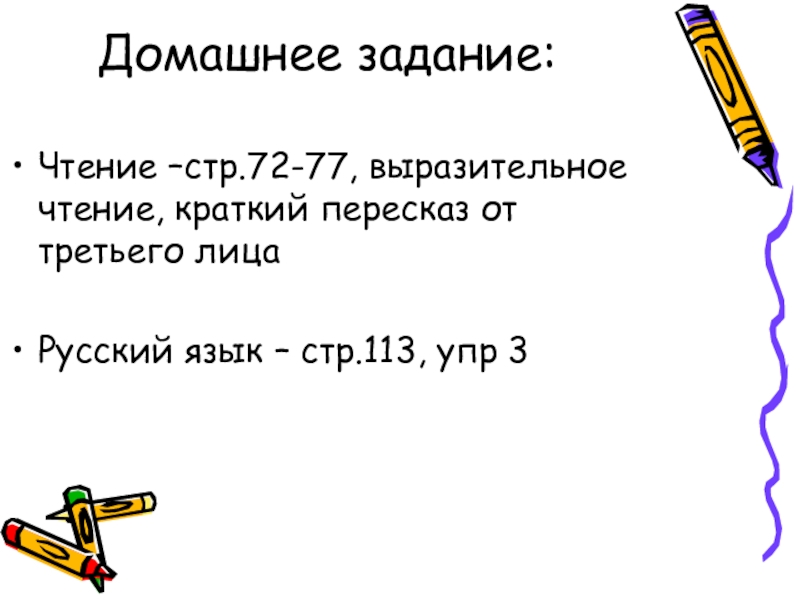 Домашнее задание:Чтение –стр.72-77, выразительное чтение, краткий пересказ от третьего лицаРусский язык – стр.113, упр 3