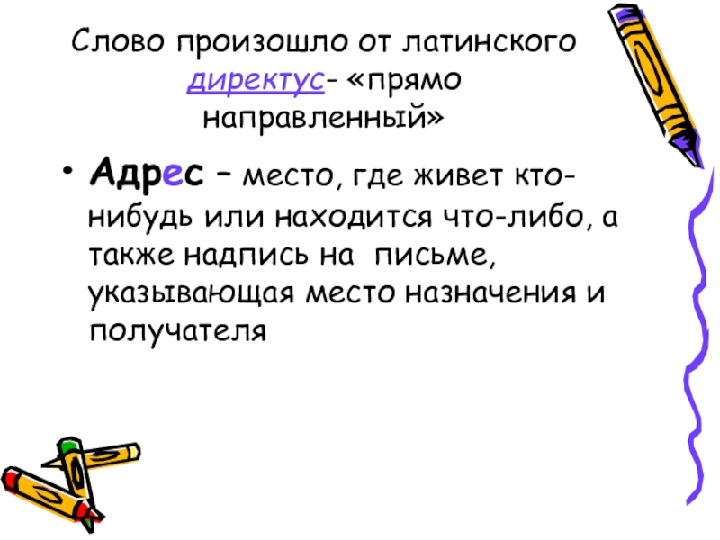 Слово произошло от латинского директус- «прямо направленный»Адрес – место, где живет кто-нибудь или находится что-либо, а также