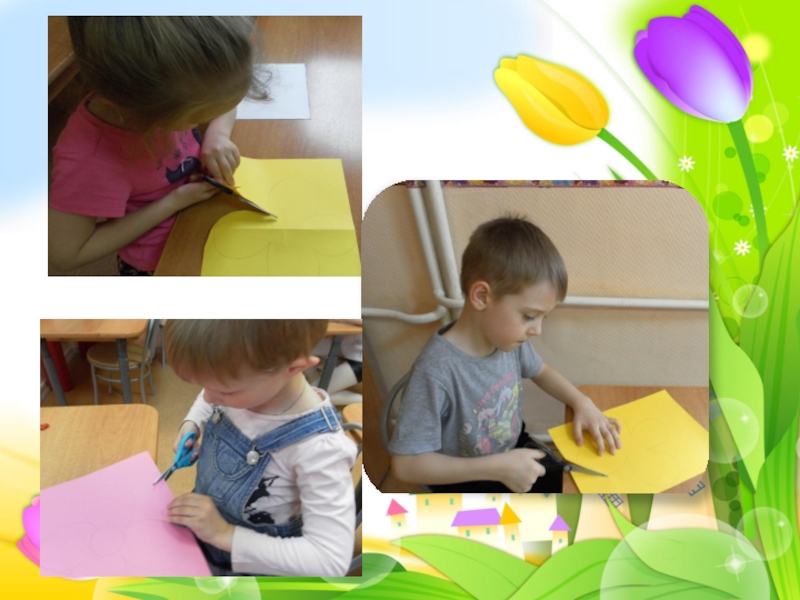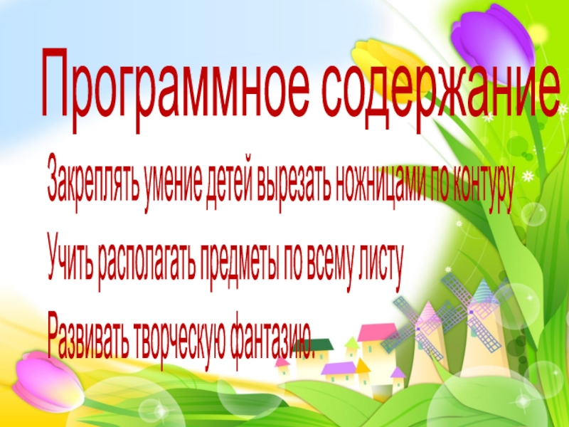Программное содержаниеЗакреплять умение детей вырезать ножницами по контуруУчить располагать предметы по всему листуРазвивать творческую фантазию.