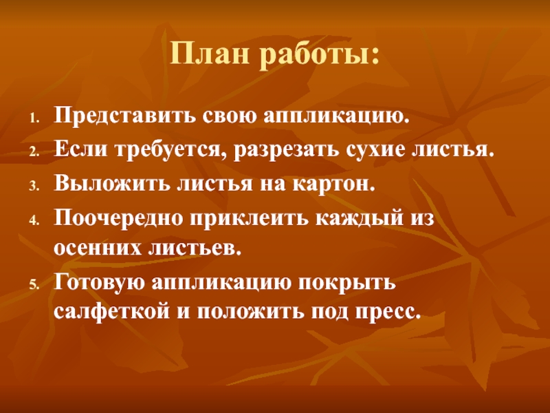 План работы:Представить свою аппликацию.Если требуется, разрезать сухие листья.Выложить листья на картон.Поочередно приклеить каждый из осенних листьев.Готовую аппликацию