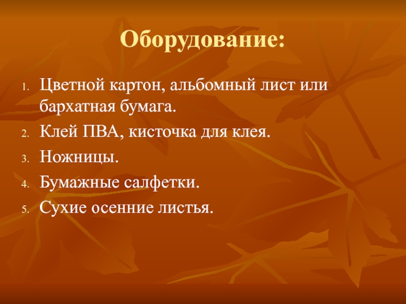 Оборудование:Цветной картон, альбомный лист или бархатная бумага.Клей ПВА, кисточка для клея.Ножницы.Бумажные салфетки.Сухие осенние листья.