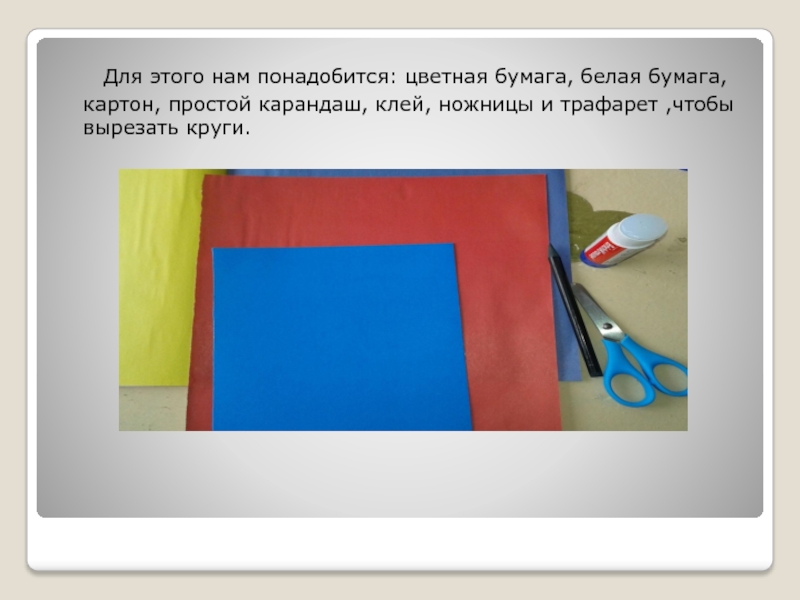 Для этого нам понадобится: цветная бумага, белая бумага, картон, простой карандаш, клей, ножницы и трафарет ,чтобы вырезать круги.
