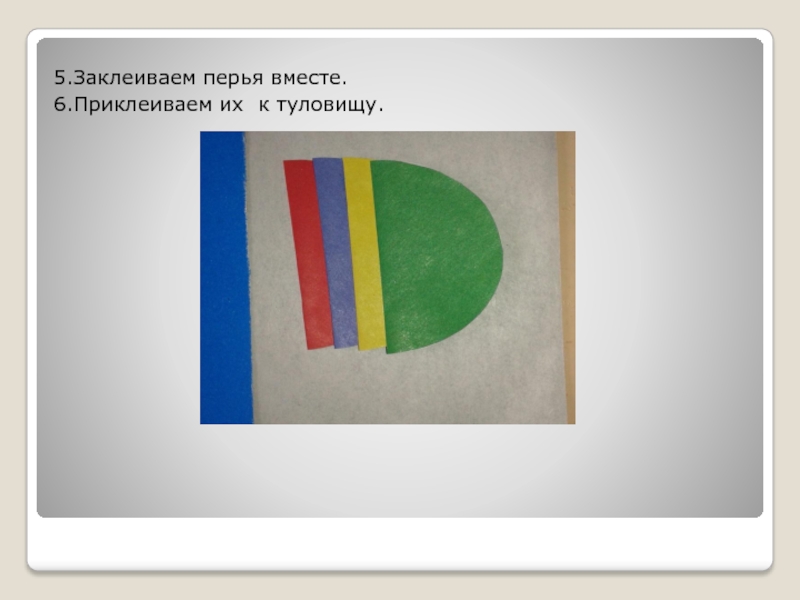 5.Заклеиваем перья вместе.6.Приклеиваем их к туловищу.