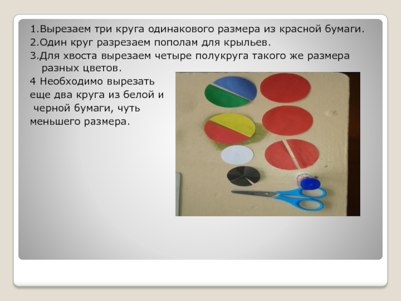 1.Вырезаем три круга одинакового размера из красной бумаги. 2.Один круг разрезаем пополам для крыльев. 3.Для хвоста вырезаем