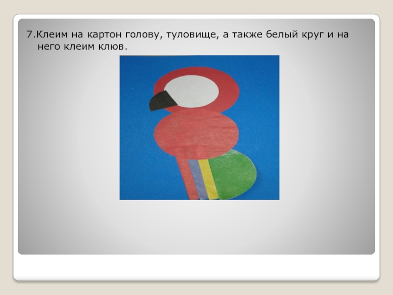 7.Клеим на картон голову, туловище, а также белый круг и на него клеим клюв.