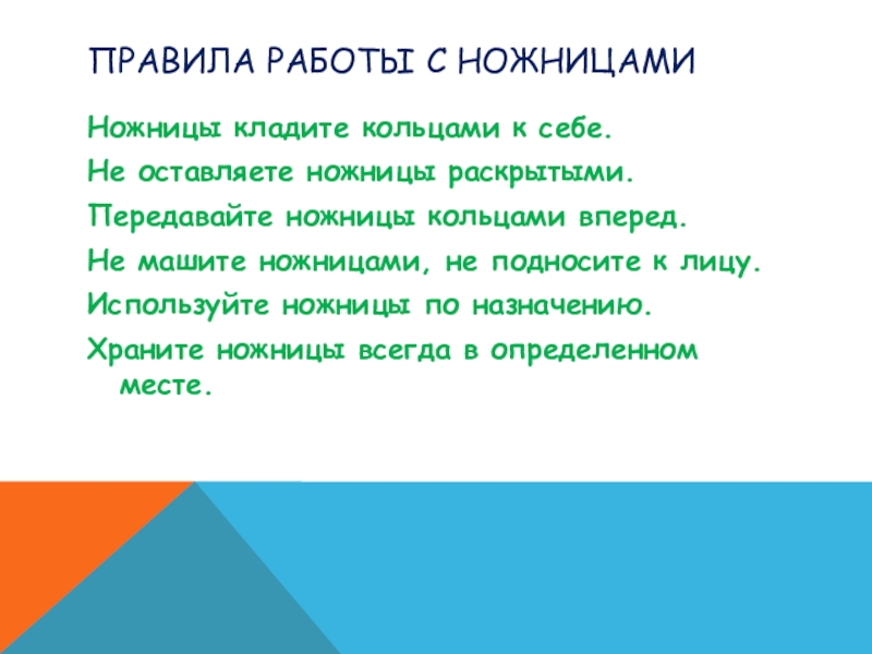 Правила работы с ножницамиНожницы кладите кольцами к себе.Не оставляете ножницы раскрытыми.Передавайте ножницы кольцами вперед.Не машите ножницами, не