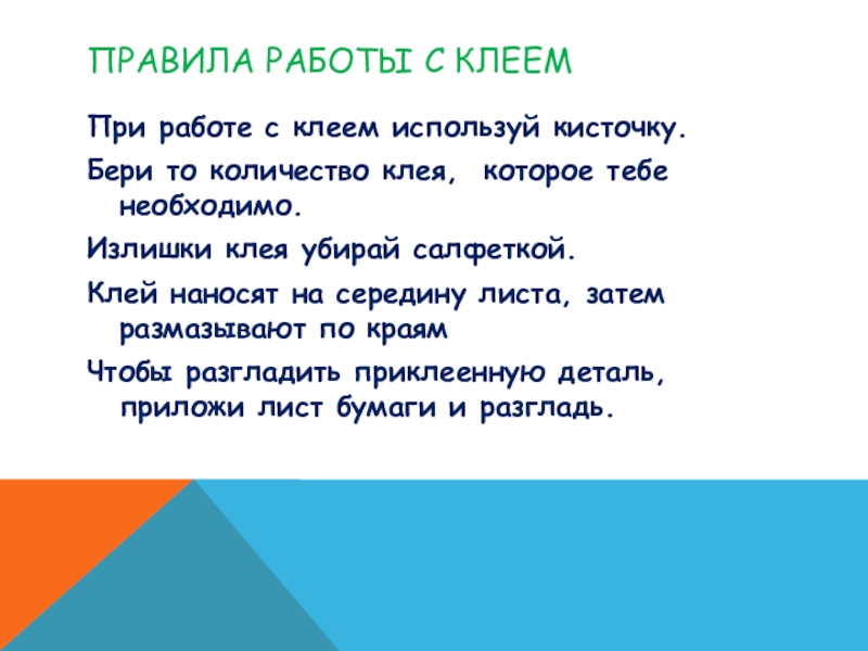 Правила работы с клеемПри работе с клеем используй кисточку.Бери то количество клея, которое тебе необходимо.Излишки клея убирай