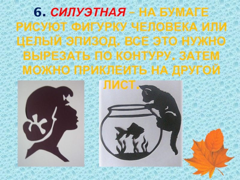 Слайд 176. Силуэтная – на бумаге рисуют фигурку человека или целый эпизод. Все это
