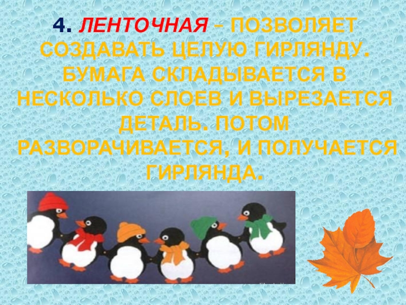 Слайд 134. Ленточная – позволяет создавать целую гирлянду. Бумага складывается в несколько слоев и