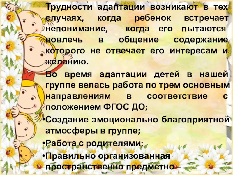 Во время адаптации детей в нашей группе велась работа по трем основным направлениям в соответствие с положением ФГОС ДО;