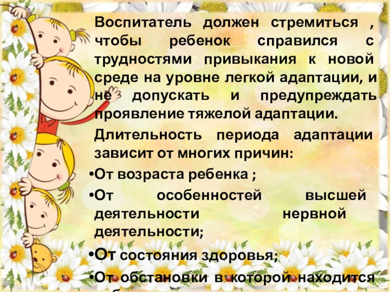 Слайд 8Воспитатель должен стремиться , чтобы ребенок справился с трудностями привыкания к
