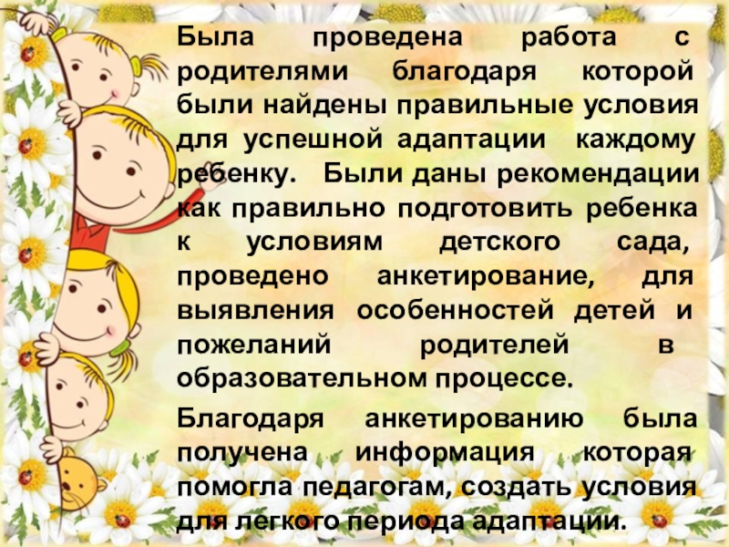 для успешной адаптации каждому ребенку. Были даны рекомендации как правильно подготовить ребенка к условиям детского сада, проведено анкетирование, для выявления особенностей детей и пожеланий родителей в образовательном процессе.