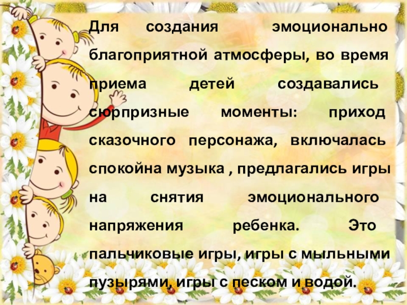 Слайд 10Для создания эмоционально благоприятной атмосферы, во время приема детей создавались сюрпризные