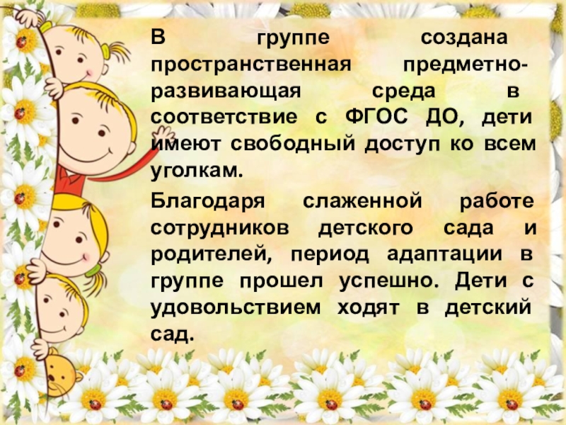 Благодаря слаженной работе сотрудников детского сада и родителей, период адаптации в группе прошел успешно. Дети с удовольствием ходят в детский сад.